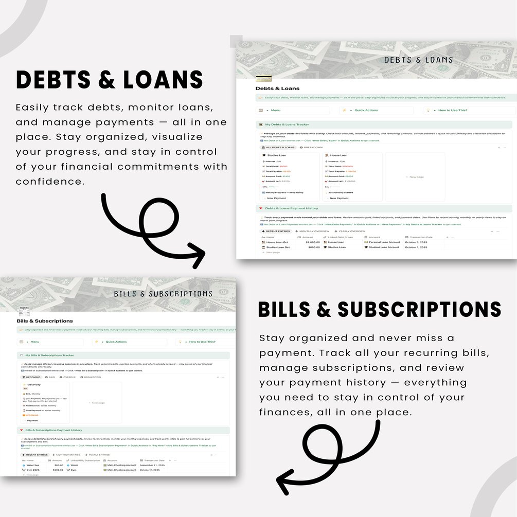 Track income, manage expenses, pay off debts, and plan your financial goals — all from one organized dashboard.